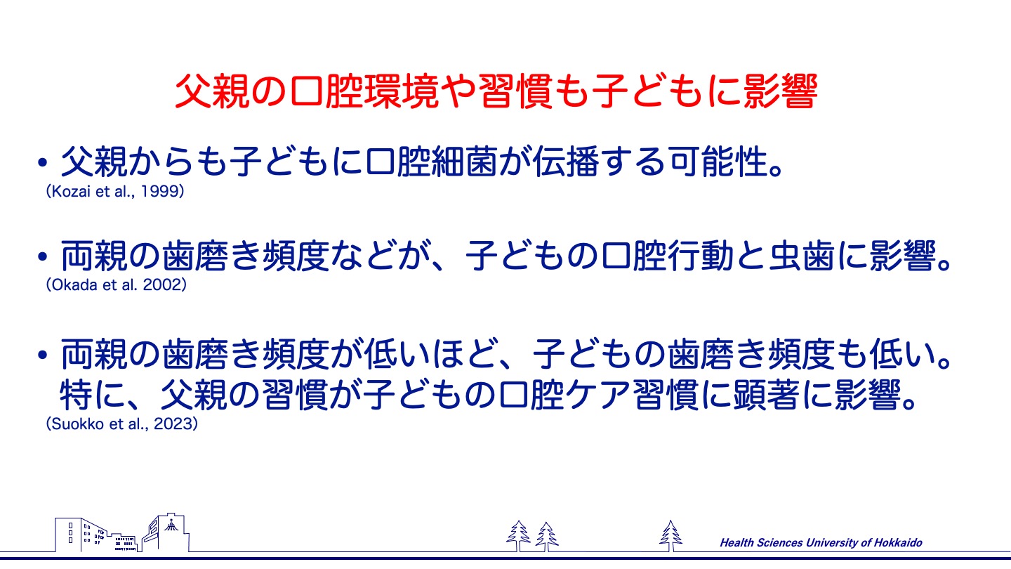 両親の口腔行動(歯磨き頻度など)が、子どもの口腔行動と虫歯状況(DT)に直接および間接的に影響することが明らかに(親の行動 → 子の行動 → 子の口腔状況)PubMed。→ 父親も家庭内で子どもの習慣づくりに重要な役割を持っています。